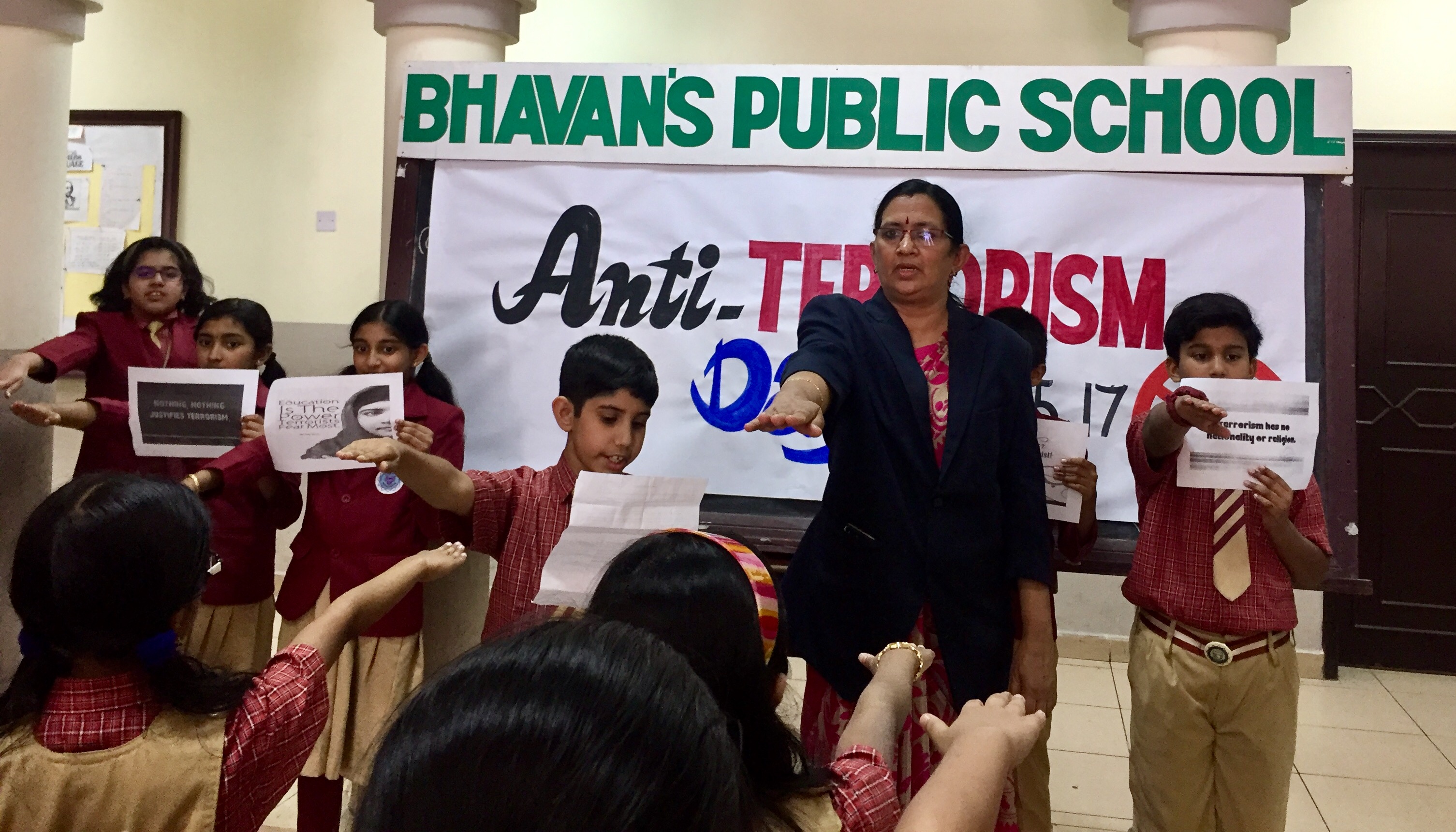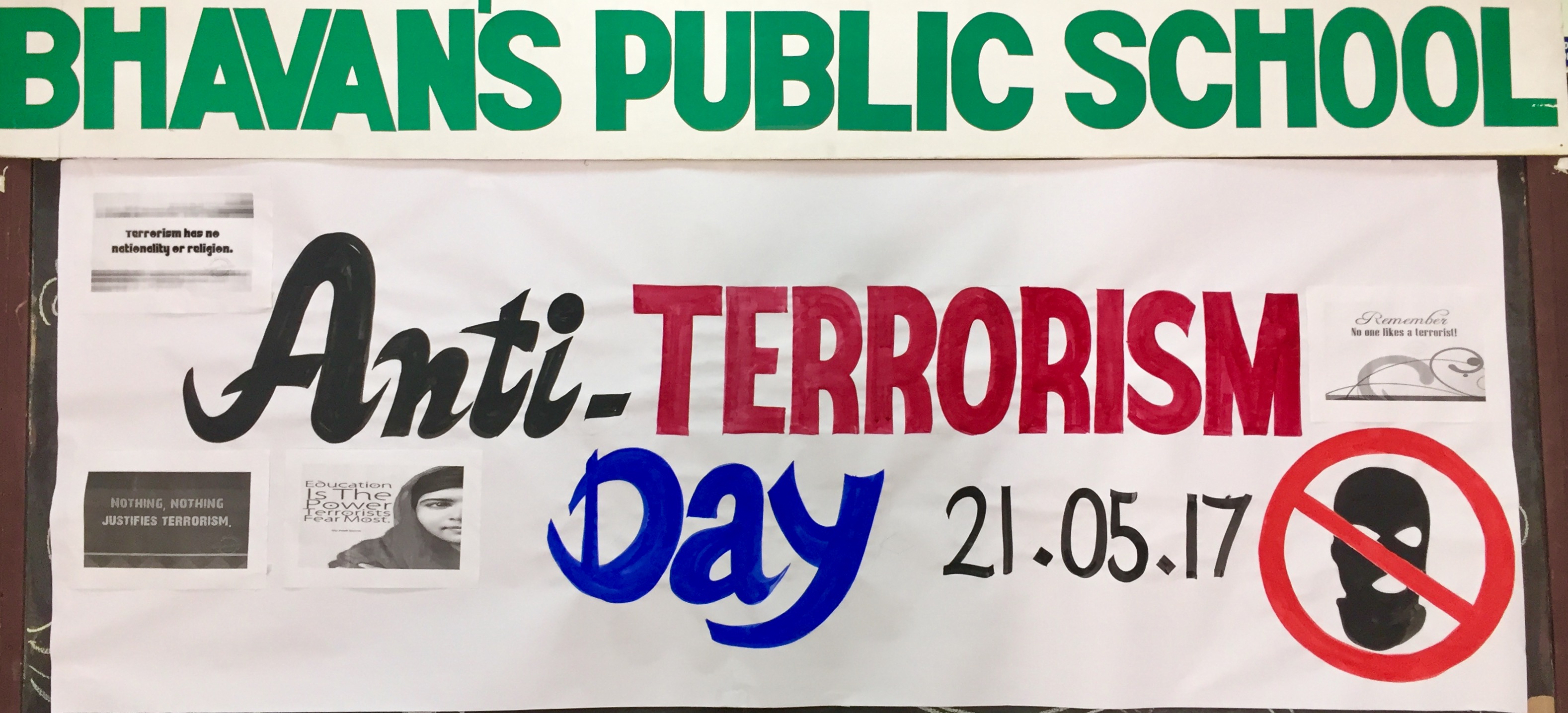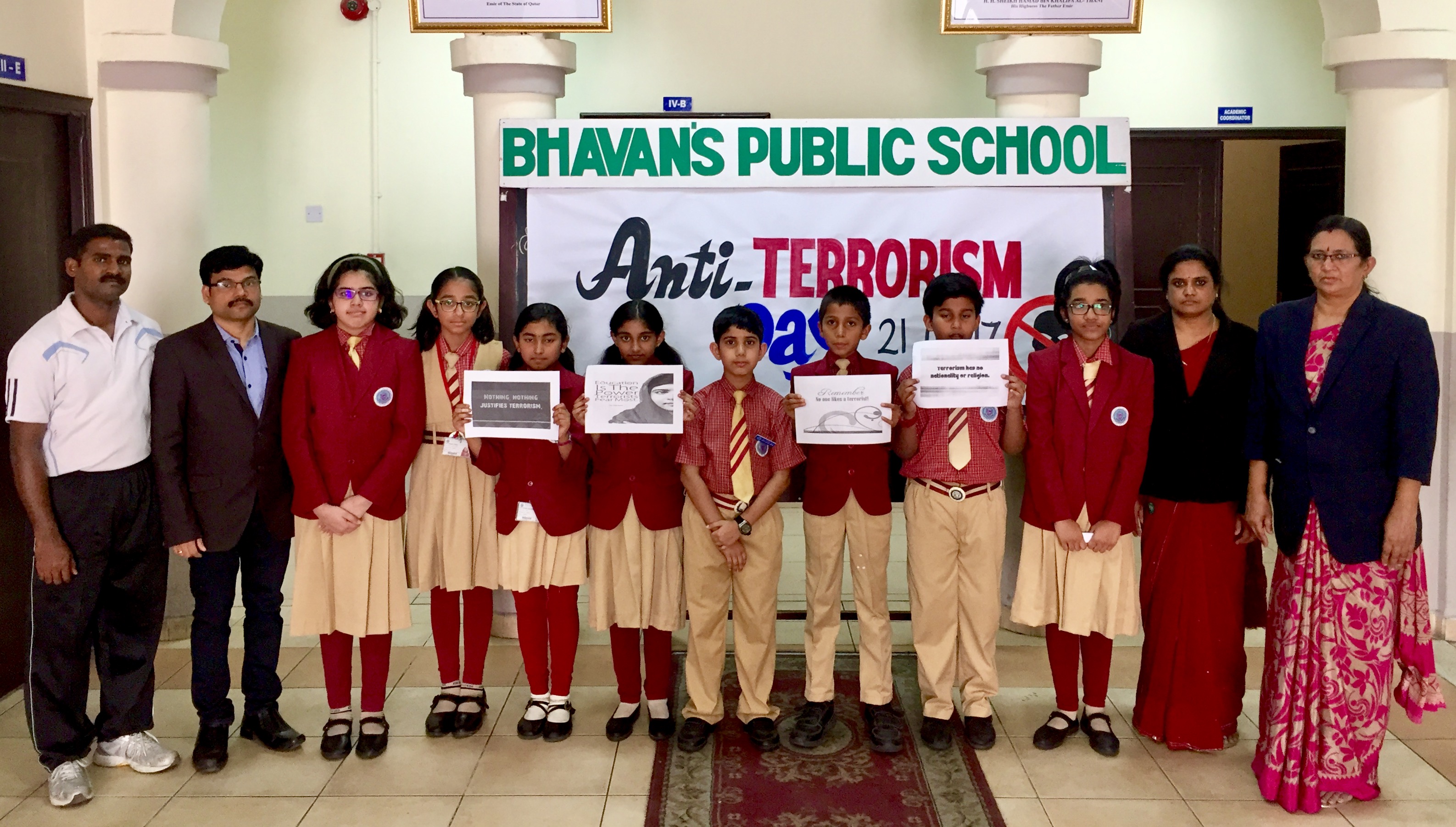 To spread the message of global peace and nonviolence, Anti-Terrorism day was observed in Bhavan’s School on 21st May 2017. A special assembly was held to commemorate and honour the sacrifices made by thousands of soldiers who battled against terrorism. Student’s payed homage to the victims who lost their lives in terrorist attack and thus the anti-terrorism pledge was taken by them. The occasion was embellished with a speech and the placard presentation. Headmistress Mrs Shailaja KrishnaKumar, addressed the students and stressed that the day is observed to generate awareness among all sections of people, about the danger of terrorism and violence.