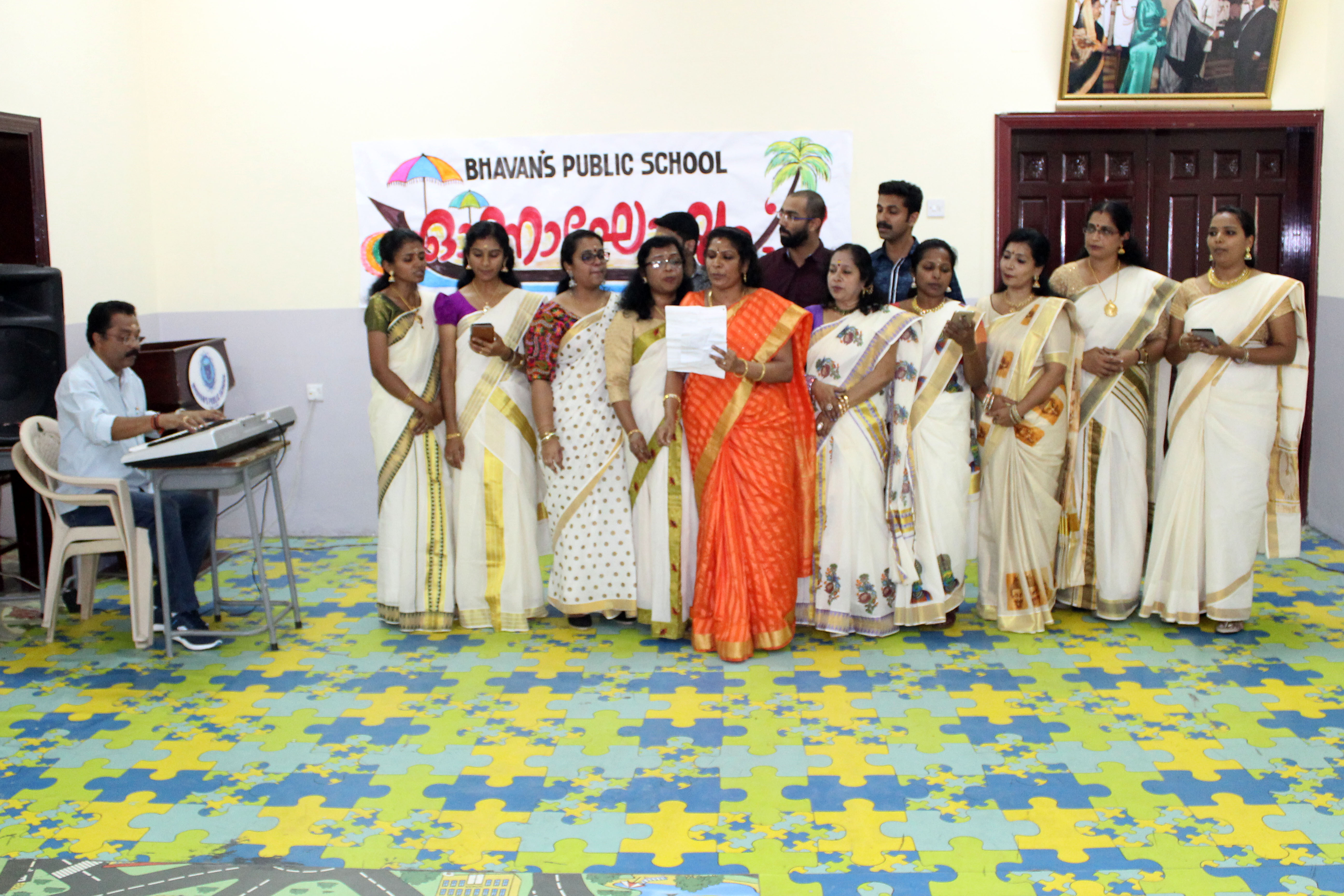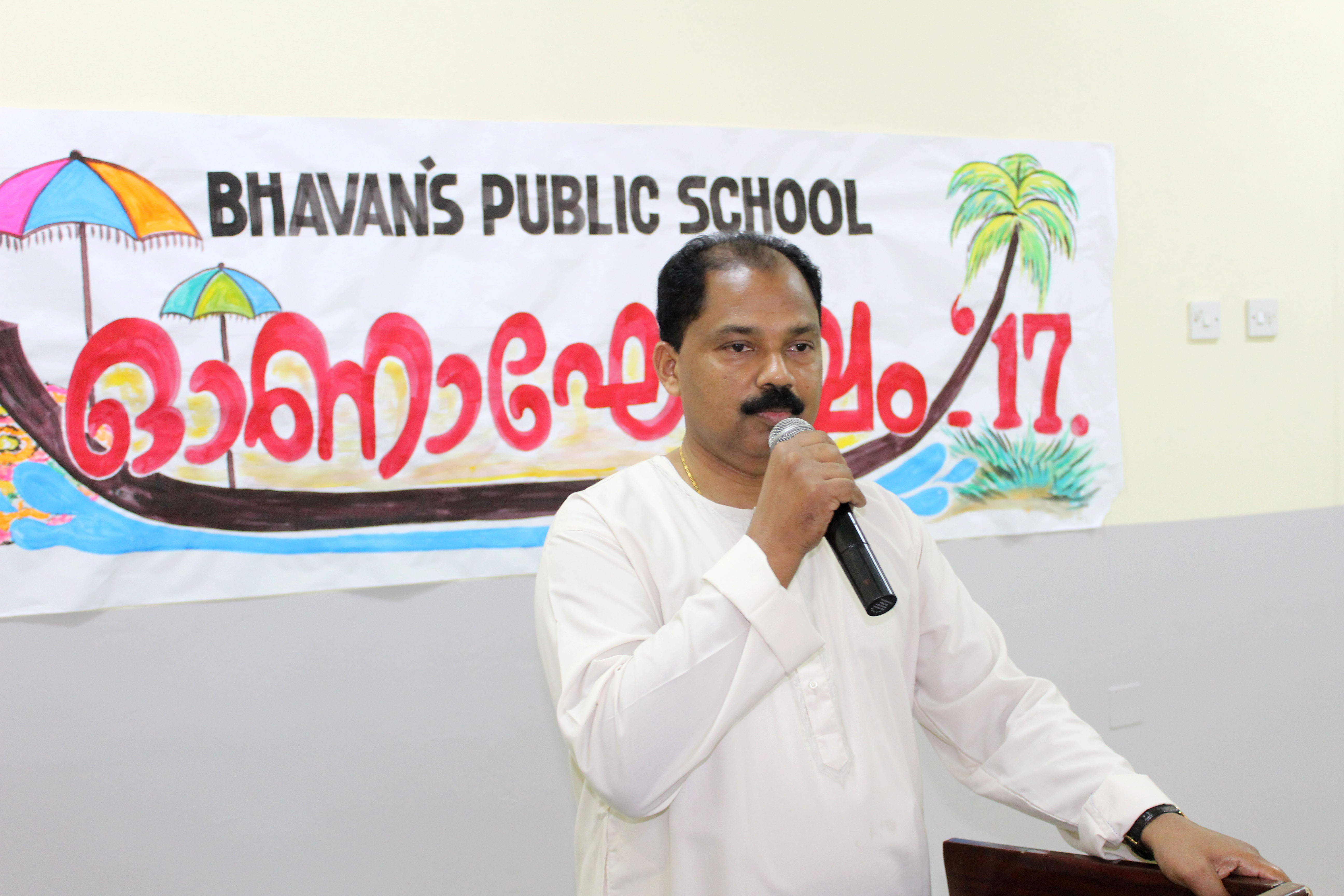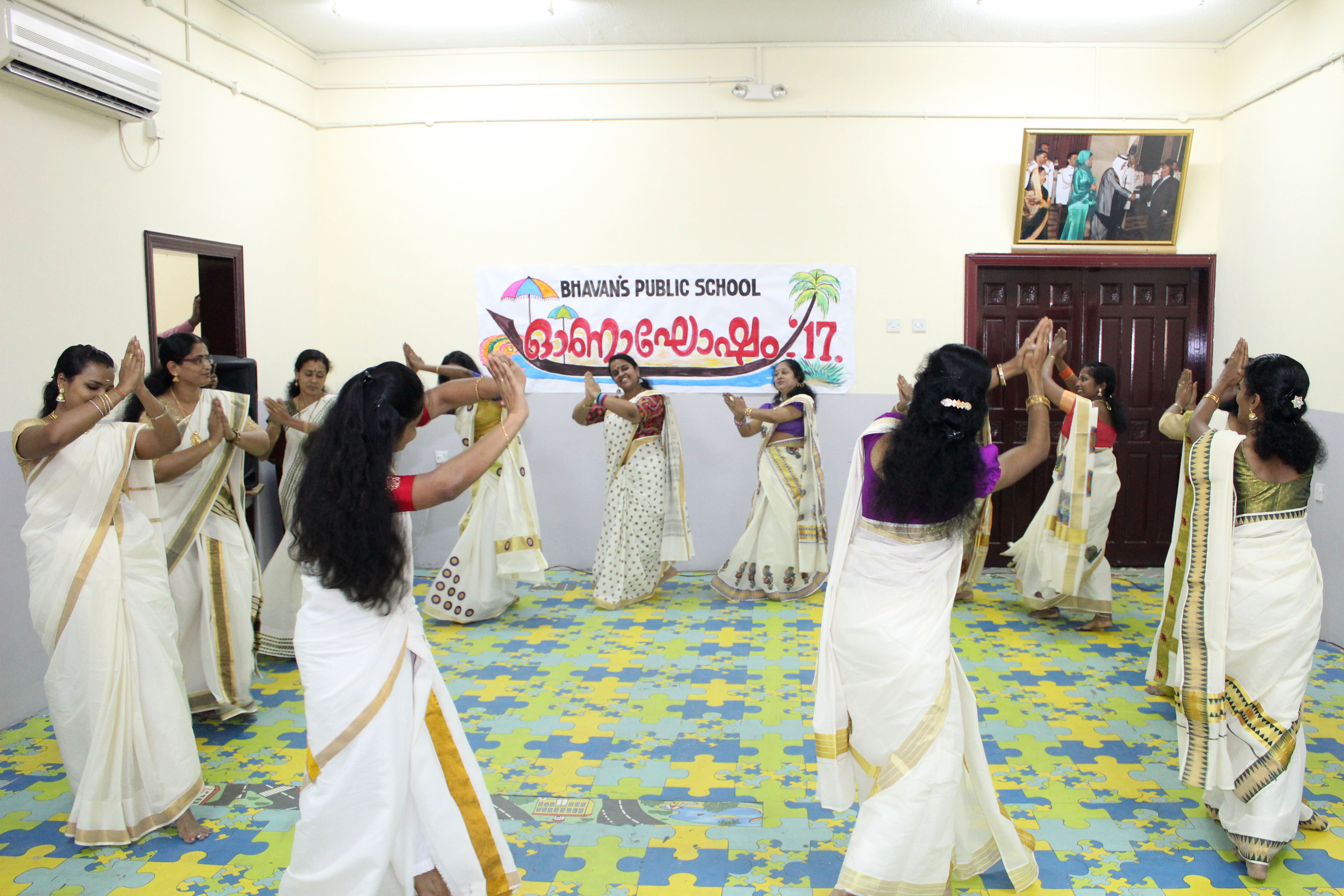 Bhavan’s Public School celebrated Onam amidst much fanfare at Matar Campus on 4th September. The function began with the Islamic Prayer recited by Mr Siyab.Principal Mr M.P.Philip in his welcome address spoke about the festival and conveyed wishes to all.Director Administartion Mrs Anjana Menon,HR manager Mr Gopinath,Headmistress Mrs Shailaja KrishnaKumar and Mrs Asha Shiju,Academic coordinators Mr Thomas and Mrs Jayashree graced the occasion. The festivities kicked off with the artistic floral decoration. The main attractions of the day were Thiruvathirakali by female staff .There were solo Onappattu by Music teachers Mr Bidul and Mrs Ambica and group of gents and ladies staff very melodiously sang group songs which were followed by fun games which helped to reincarnate a past of prosperity and goodness.