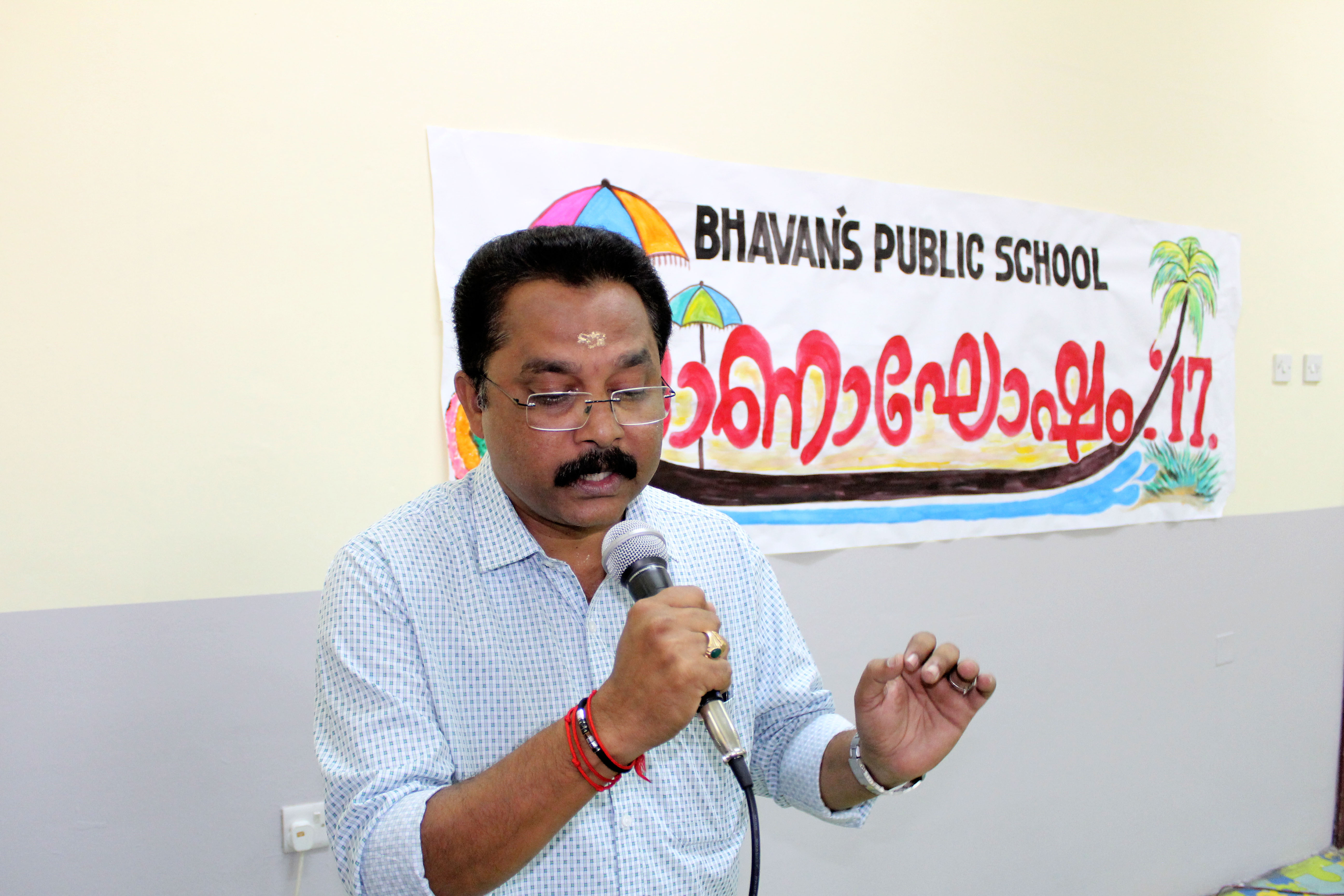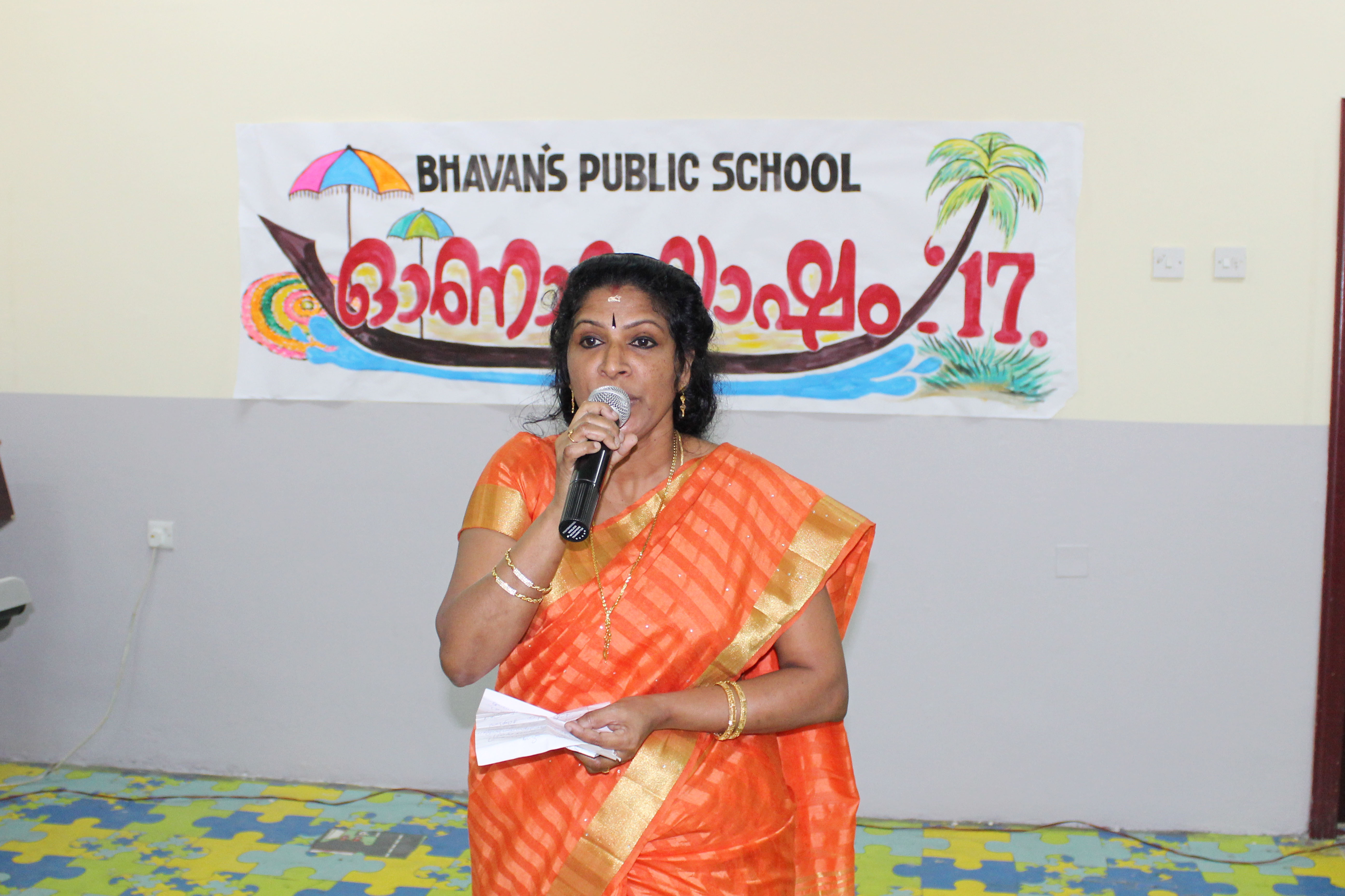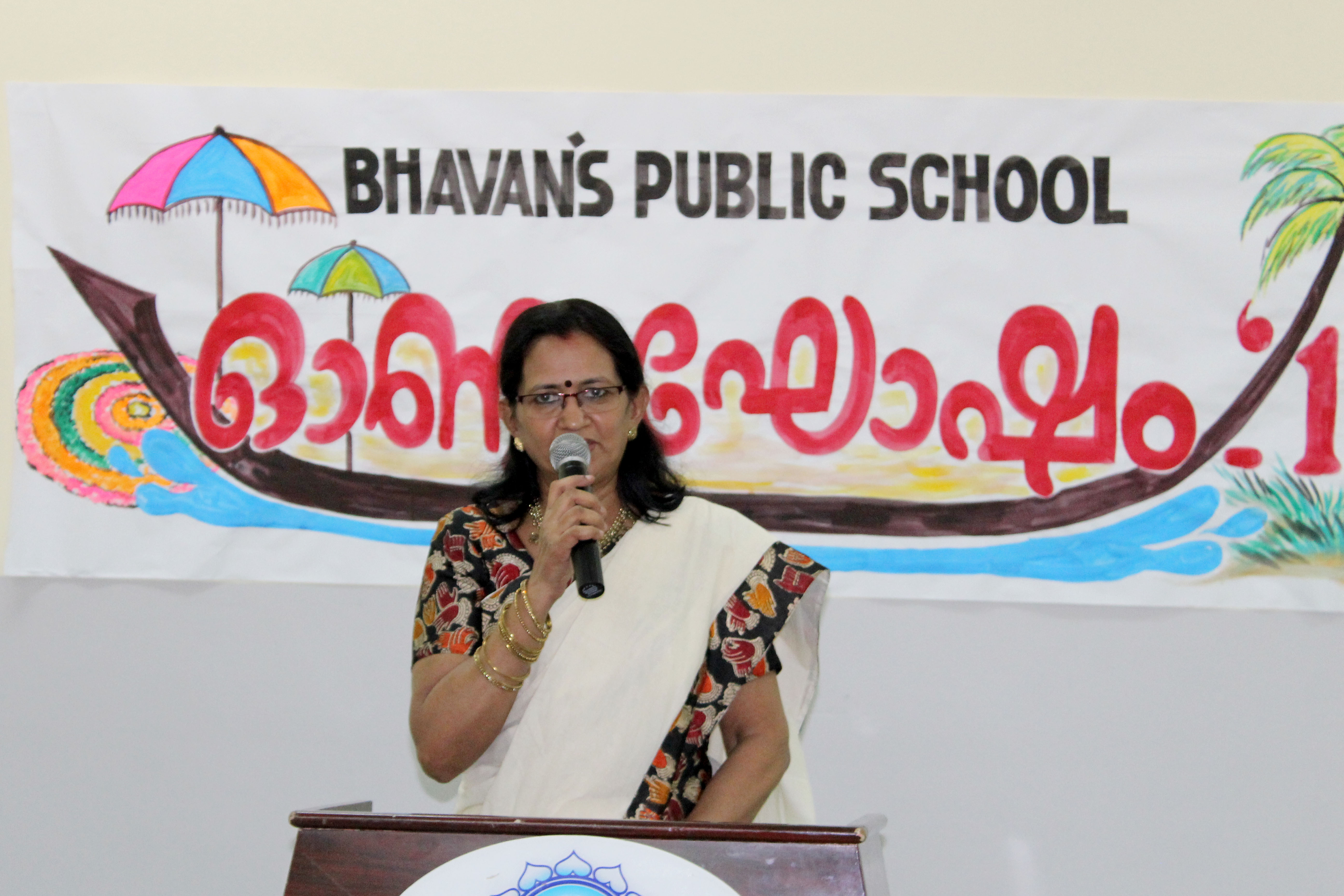 Bhavan’s Public School celebrated Onam amidst much fanfare at Matar Campus on 4th September. The function began with the Islamic Prayer recited by Mr Siyab.Principal Mr M.P.Philip in his welcome address spoke about the festival and conveyed wishes to all.Director Administartion Mrs Anjana Menon,HR manager Mr Gopinath,Headmistress Mrs Shailaja KrishnaKumar and Mrs Asha Shiju,Academic coordinators Mr Thomas and Mrs Jayashree graced the occasion. The festivities kicked off with the artistic floral decoration. The main attractions of the day were Thiruvathirakali by female staff .There were solo Onappattu by Music teachers Mr Bidul and Mrs Ambica and group of gents and ladies staff very melodiously sang group songs which were followed by fun games which helped to reincarnate a past of prosperity and goodness.