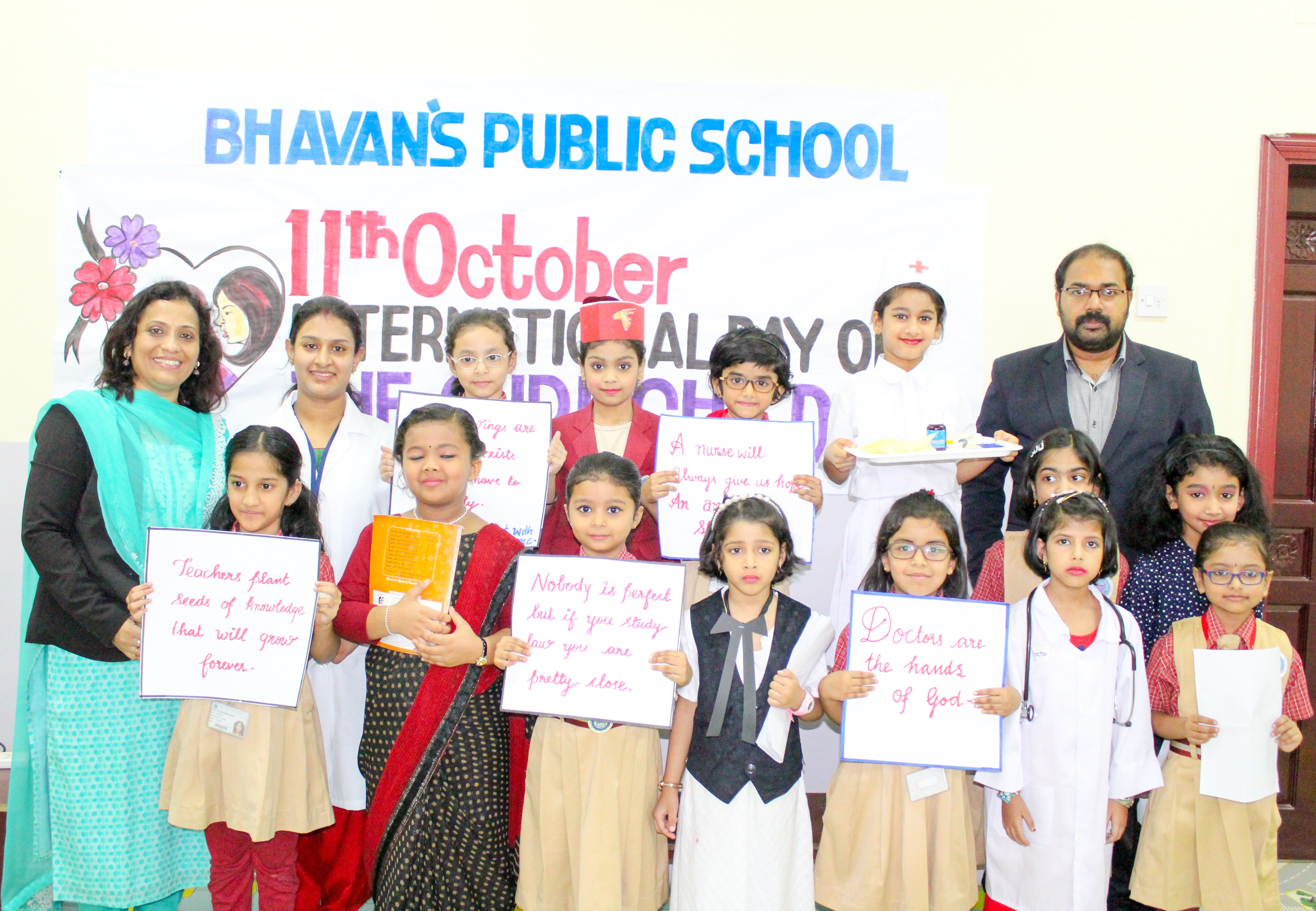 To raise the consciousness of the students of the need to respect girls, Bhavan’s Public School celebrated International Girl Child day on 12th October with zest and zip in all three campuses. Students at Wakra, presented a skit to promulgate the paramountcy of girls in the society. The campus at New Salata was in glow in colours as the girl children were given the chance of expressing the importance of the day with their drawings. It became more beautiful when they garnered their drawings in the 30 meters long canvas as the regalia of unity and equality. At Matar campus students of class 2 presented an assembly which paid tribute to the spirit of being a girl and reflected the successful emergence of the girls in every sphere of life and instilled the message to fight against the social stigma about the girl child to achieve gender parity. Also to highlight and address the needs and challenges girls face, the team of girls under the leadership of School Deputy leader Ms.Chaman urged the students with the message ‘Dream high , reach your goals with confidence’ to take a pledge to create a friendly environment for the girls and to treat all girls on par with the boys. Short film was also shown on the awareness of inequality faced by girls worldwide based upon their gender. Principal Mr.M.P.Philip, in his address, conveyed the issues concerning the gender inequality facing young girls and pinpointed to stand with the global community to support girls’ progress everywhere. Headmistress Mrs Shailaja Krishna Kumar and Mrs Asha.Shiju emboldened the students that every girl child must be given a chance to outshine by turning challenges into opportunities. Activity coordinators and academic coordinators graced the occasion.