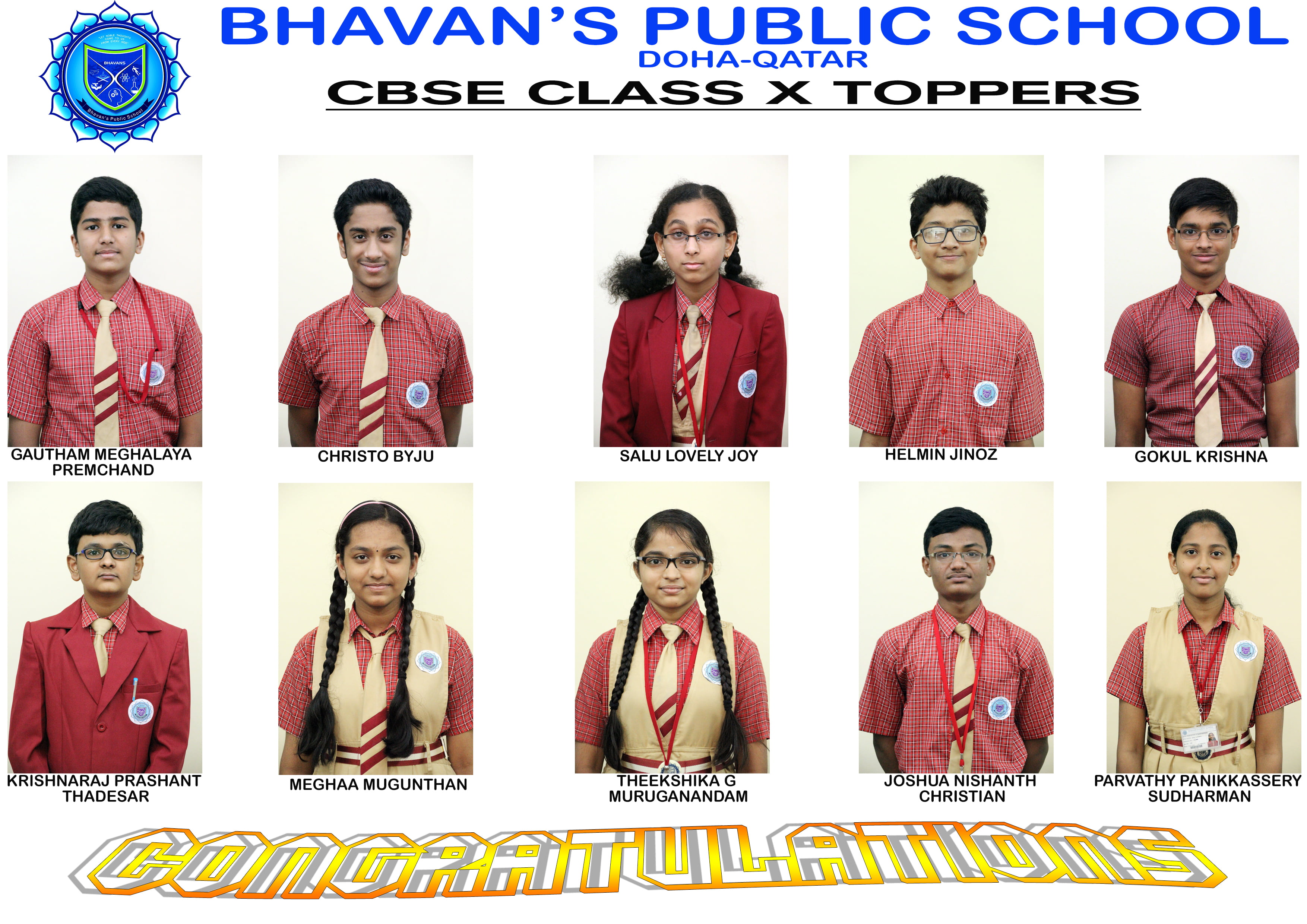 Bhavans’ Public School registered cent percentage results in the Class X CBSE Examination. Top scores of the school include Master Gautham M P, 95.2%, Master Christo Byju- 92.8%, Ms.Salu Lovely : 92.4 %, Master Helmin Jinoz:- 92.2%, and Master Gokul Krishna: 92.2%A spectacular 71% of Students scored above Distinction marks with 15% of students above 90% marks.21 % of students scored above First Class and 9% of students above Second class. And no student has scored below second class.Management, Principal, Staff congratulated the Class X students for this marvelous achievement.